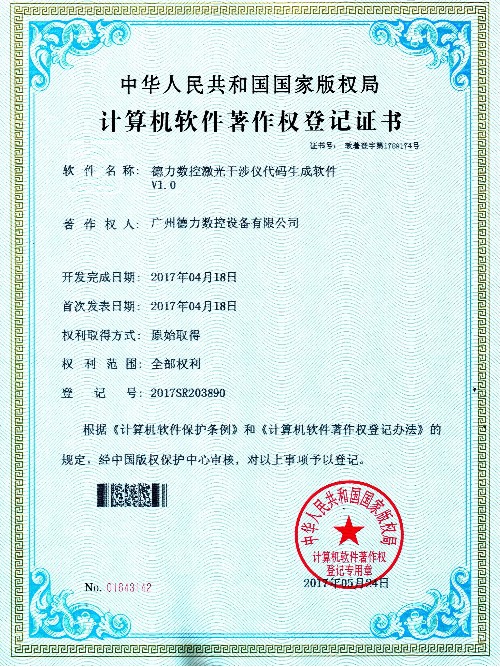 計算機軟件著作權登記證書(德力數(shù)控激光干涉儀代碼生成軟件)