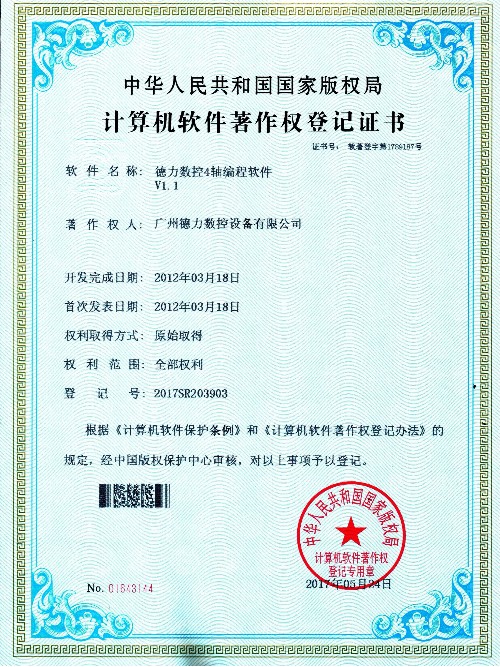 計算機軟件著作權登記證書(德力數(shù)控四軸編程軟件)